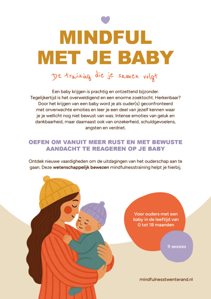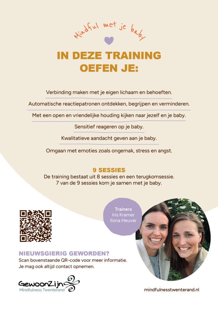 Waarin deze training écht anders is dan de andere trainingen die ik aanbied, is dat je baby er bijna alle bijeenkomsten bij zal zijn. De oefeningen zijn hier ook op aangepast. Zo oefenen we met kijkmeditaties, waarbij je baby je object van aandacht is, zijn er oefeningen gericht op het contact maken met je kindje en het omgaan met stressmomenten (ook tijdens de training). Voor thuis krijg je oefeningen en opdrachten mee zodat je het geleerde kunt toepassen in je dagelijkse leven.